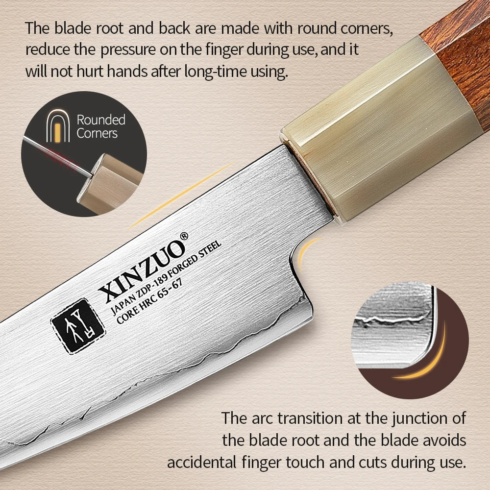 Die kurze, wendige Klinge aus extrem hartem ZDP-189 Verbundstahl bietet überragende Schärfe, enorme Standzeit und exzellente Korrosionsbeständigkeit – perfekt für feine, kontrollierte Schnitte.