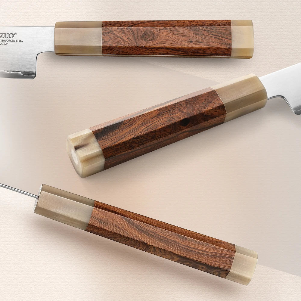 Der Griff aus hochwertigem Wüsten-Eisenholz mit einem Abschluss aus weißem Bullenhorn ist nicht nur besonders langlebig, sondern auch ein optisches Highlight. Die ergonomische Form sorgt für eine sichere, komfortable Handhabung – auch bei längeren Schneidarbeiten.